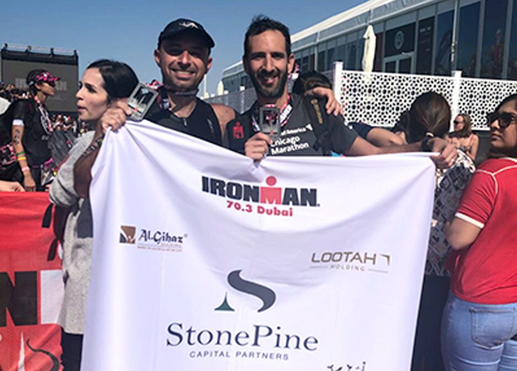 Youssef Haidar and Renan Baroukh from StonePine Capital Partners take part in the IronMan 70.3 Dubai Triathlon event.